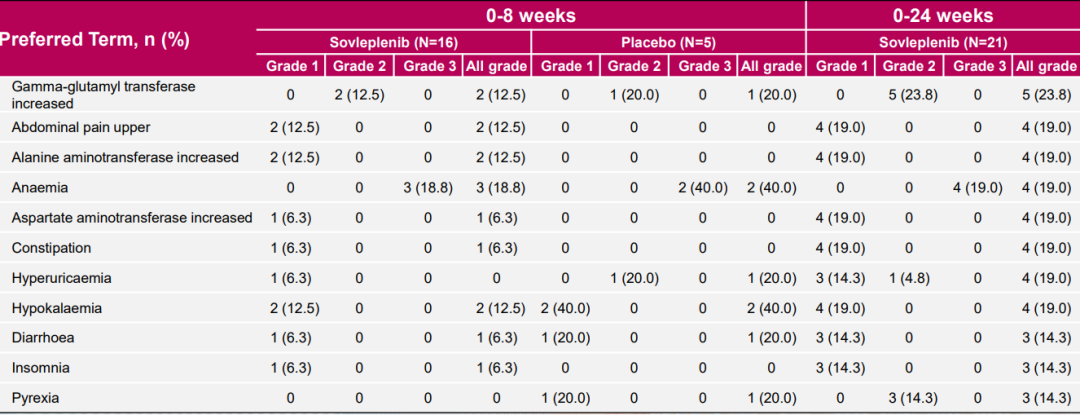 在ESLIM-02 II期研究中,没有患者因治疗期间出现的不良事件(TEAEs)而停药。与安慰剂相比,索乐匹尼布组在各级别TEAE的发生率均较低,且未观察到≥4级的不良事件。TEAE包括1/2级的γ-谷氨酰转移酶和肝酶升高等。这些数据或可表明,索乐匹尼布在wAIHA治疗中有望提供一种患者可耐受的治疗选择。