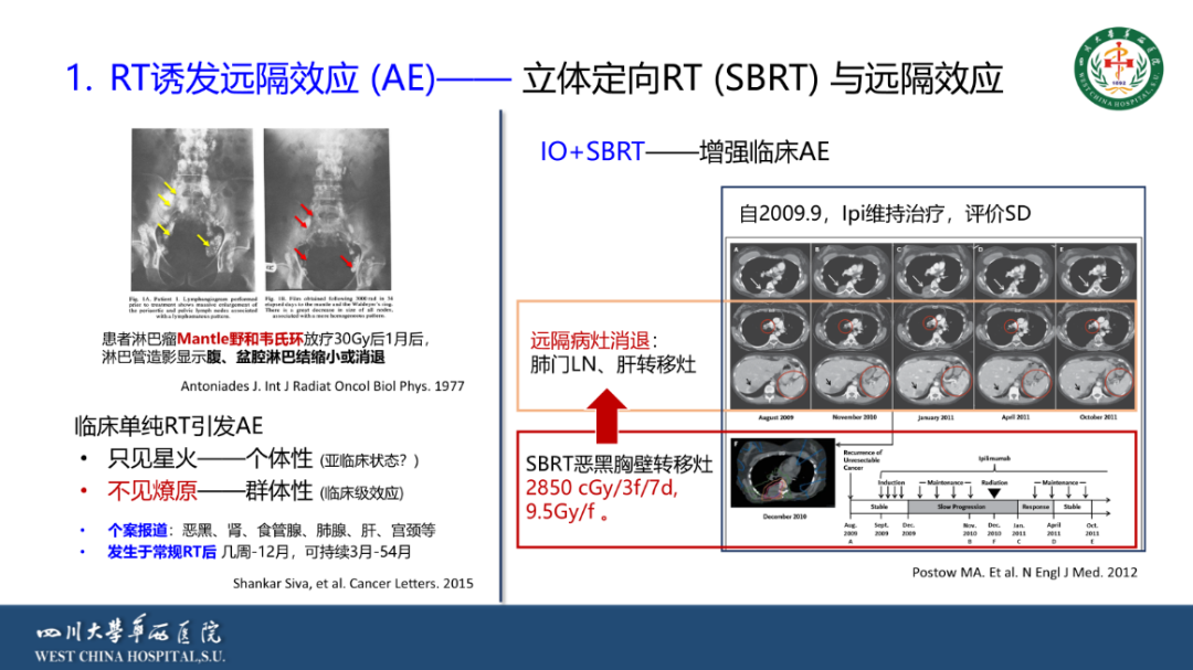 立体定向放射治疗(SBRT)作为一种高精度、高剂量的放射治疗技术,能够在较短的时间内给肿瘤区域提供极高剂量的放射线,通常用于治疗小而局限的肿瘤。在放疗与免疫效应的密切关联中,放疗远隔效应(AE)不容忽视。早在1977年,有研究发现,淋巴瘤患者Mantle野和韦氏环放疗30Gy后1个月后,淋巴瘤造影显示腹、盆腔淋巴结缩小或消退,被认为发生了SBRT诱发的远隔效应(AE),即在肿瘤接受放疗时,除了直接照射的病灶被杀伤外,其他未照射的病灶也出现了缩小现象。卢铀教授介绍道,在此之后的几十年临床研究中,单纯由RT引发AE现象只见于少数个案,未见大样本临床报道。2012年《新英格兰医学杂志》发表的一篇个案报道,介绍免疫联合SBRT治疗恶性黑色素瘤患者,产生免疫远隔效应,此引起肿瘤学界强烈关注。此后2-3年间,在CT.gov(ClinicalTrials.gov)上注册了200余项SBRT放疗联合免疫治疗相关临床研究,迅速掀起研究AE热潮。