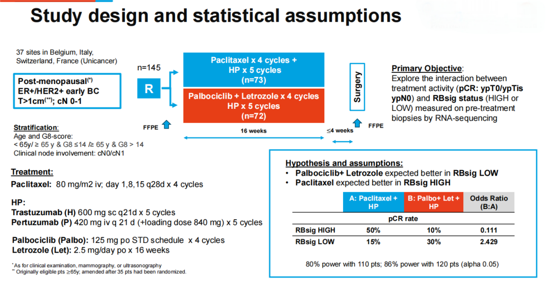 TOUCH研究是一项国际、开放标签、II期临床试验,纳入了分期为cT>1 cm,cN0或cN1的HR+/HER2+绝经后乳腺癌患者,随机分为两组(1:1):