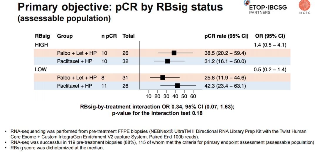 主要研究目标是评估E2F通路活性(RBsig)基因特征与病理完全缓解率(pCR,定义为ypT0/ypTis ypN0)之间的交互作用,假设RBsig高的肿瘤在T+HP组具有更高的pCR率,而RBsig低的肿瘤在Pal+L+HP组中具有更高的pCR率。RNA测序通过NEBNext®UltraTM II方向性RNA文库制备试剂盒完成,并使用Twist Human Core Exome+Custom IntegraGen富集系统进行捕获,100对端读取。RBsig评分通过标准化所有基因表达值后求和计算,并按中位数将评分分为高低两组。通过逻辑回归模型评估治疗与RBsig的交互作用。