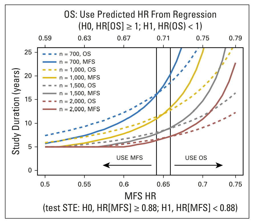 △在使用MFS HRs和检验替代阈值效应(STE;实线)或使用加权线性回归预测的OS HRs(虚线)的研究设计中,所需的总研究持续时间[12]