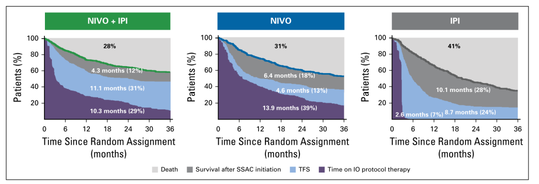 2019年发表于JCO的一项汇总分析[13],则探讨了TFS作为免疫检查点抑制剂(ICIs)的新结局指标。尽管PFS和OS的评估指导了药物监管部门的批准和临床决策,但这些传统终点可能不能全面评估ICIs的疗效。停止ICIs治疗的患者可能获得持久的缓解或疾病控制期,而不需要随后的系统治疗。因此亟需新的评估指标,进一步精准评估ICIs的抗肿瘤活性及药物毒性。在汇总CheckMate 067/069的入组患者发现,Ipi、Nivo、Nivo+Ipi三组患者OS依次延长(21.4、24.9、25.7个月),TFS与之表现一致,Ipi、Nivo、Nivo+Ipi三组患者依次延长。