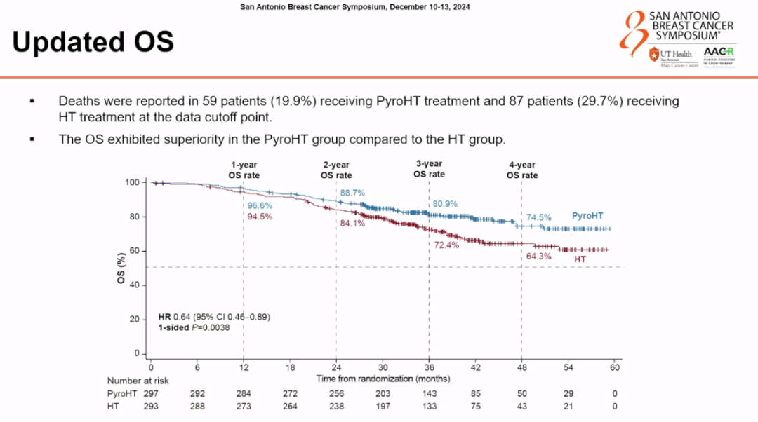 此次数据截止时间为2024年4月30日,结果显示,PyroHT组与HT组的中位随访时间分别为35.7个月和34.3个月。PyroHT组和HT组研究者评估的中位PFS分别为22.1个月vs.10.5个月(HR=0.44;95%CI:0.36~0.53;P<0.0001)。尽管OS数据尚未成熟,但显示了积极的获益,死亡风险降低36%(HR 0.64,单侧P=0.0038),吡咯替尼组有74.5%的患者可达到4年生存,而对照组为64.3%。