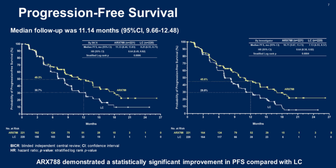截至2022年12月21日,共有221名患者被随机分配接受ARX788治疗,220名患者接受LC治疗,共发生了240起PFS事件。中位随访11.14个月,根据BIRC的评估,ARX788组的中位PFS为11.33个月,而LC组为8.25个月(HR=0.64,P=0.0006)。