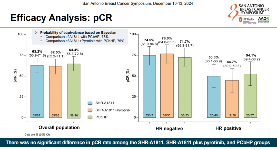 结果显示,SHR-A1811组、SHR-A1811联合吡咯替尼组和PCbHP组的pCR率没有显著差异。SHR-A1811组患者的pCR率为63.2%;SHR-A1811联合吡咯替尼组的pCR率为62.5%;而PCbHP组的pCR率为64.4%。安全性方面,SHR-A1811单药组和PCbHP组3/4级不良反应占比分别为44.8%和38.8%,SHR-A1811单药组耐受性较好,因不良事件所致剂量减少、停药比例最低。