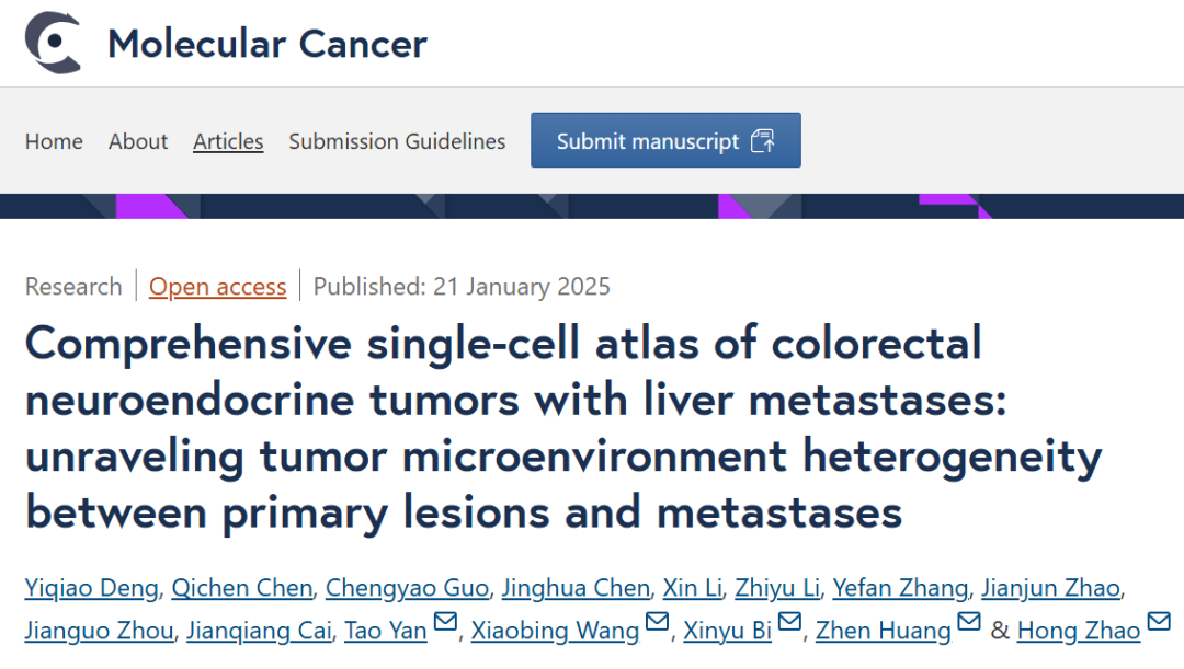编者按:近日,Molecular Cancer杂志(中科院1区,即时IF=32)在线发表了中国医学科学院肿瘤医院赵宏教授团队的研究成果(论文题目:Comprehensive single-cell atlas of colorectal neuroendocrine tumors with liver metastases:unraveling tumor microenvironment heterogeneity between primary lesions and metastases)[1]中国医学科学院肿瘤医院赵宏教授、黄振教授、毕新宇教授、王小兵教授和阎涛教授为本次发表论文的共同通讯作者;邓弈樵博士、陈启晨医生和郭成尧博士为共同第一作者。