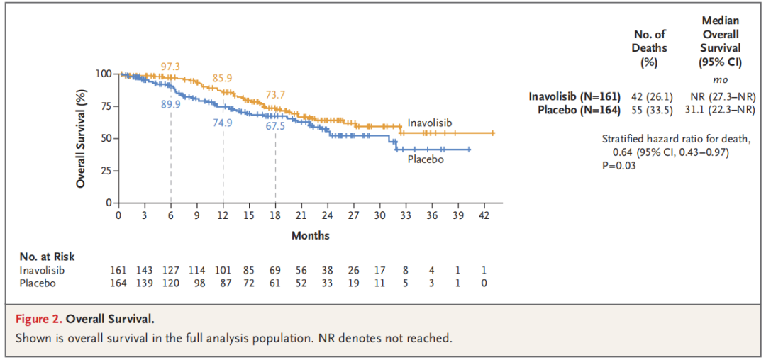 总生存(OS)分析显示,伊那利塞组6个月、12个月和18个月的OS率分别为97.3%、85.9%和73.7%,而安慰剂组对应的OS分别为89.9%、74.9%和67.5%。死亡分层风险比(伊那利塞vs安慰剂)为0.64(95%CI:0.43~0.97;P=0.03,未跨过预设的显著性界值P<0.0098)(图2)。