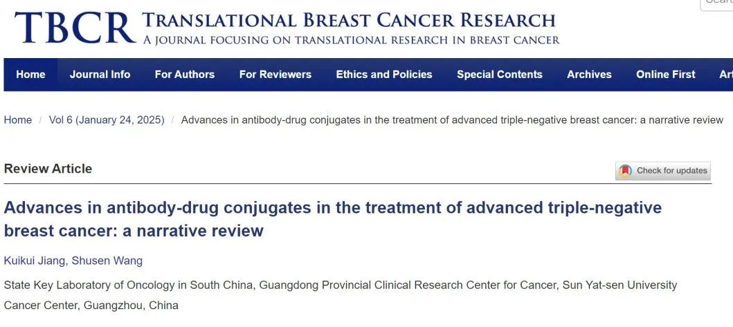 三阴性乳腺癌(TNBC)一直被认为是预后最差的乳腺癌类型,因为此类乳腺癌异质性强,缺乏明确有效的治疗靶点。尽管靶向、免疫治疗取得了一定的进展,但并未使晚期TNBC患者预后带来“质的飞跃”。抗体偶联药物(ADC)的更新迭代,为TNBC患者带来了新的治疗希望。近日,中山大学肿瘤防治中心王树森教授、蒋逵葵医生在《转化乳腺癌研究》(Translational Breast Cancer Research,TBCR)发表综述文章,总结了ADC治疗晚期TNBC的研究进展。《肿瘤瞭望》特邀王树森教授团队介绍该综述的亮点内容和精彩观点如下。