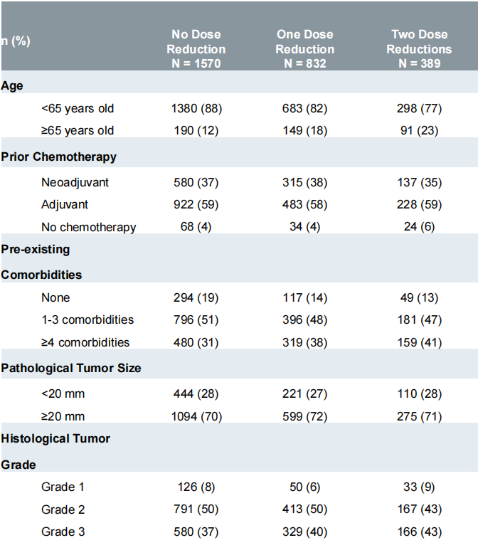 降低剂量通常用于管理与治疗相关的毒性,目的是最大限度地提高治疗依从性。降低剂量对药物疗效和对患者、医务人员都很重要。在阿贝西利的晚期乳腺癌(MBC)试验中,类似的剂量降低并未影响无进展生存期(PFS)[2]。在monarchE研究中,许多患者接受了剂量调整以管理不良反应:61.7%的患者维持了剂量,43.6%的患者降低了剂量(29.5%的患者降低了1次,13.9%的患者降低了2次)。18.5%的患者因不良事件停用阿贝西利,大多数发生在治疗的前6个月内。因不良事件停用阿贝西利的患者中,超过一半患者之前没有减量[3-4]。对此,研究者进行了探索性分析,以探讨monarchE研究中剂量调整对疗效的影响。