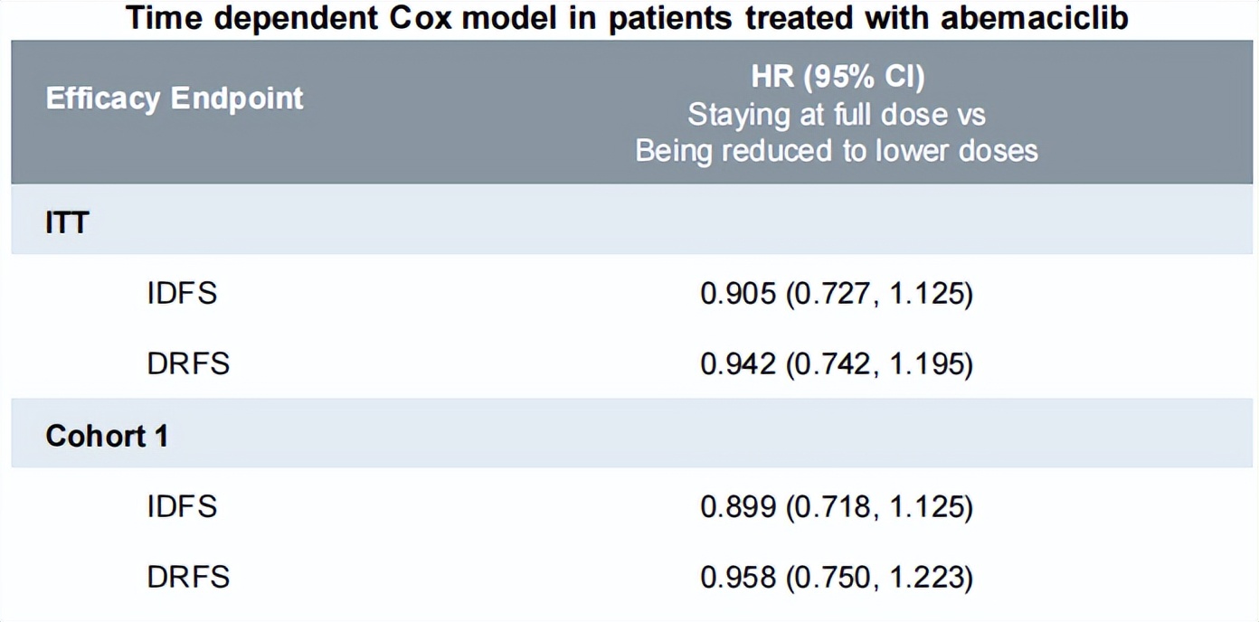 在monarchE研究中,允许在停药前最多对阿贝西利剂量进行2次减量调整(100或50mg)。根据阿贝西利的相对剂量强度[RDI定义为相对于每日全剂量(每日150mg),每例患者在实际治疗期间的平均每日剂量],根据RDI将接受阿贝西利治疗的患者分为3个相同大小的亚组,采用Kaplan-Meier计算各亚组的IDFS率。由于剂量调整可导致RDI降低,本分析是对剂量降低和疗效的间接评估,未考虑剂量调整的时间和持续时间。同时,还采用了COX比例风险(PH)模型来评估随时间变化的剂量水平对IDFS的影响。