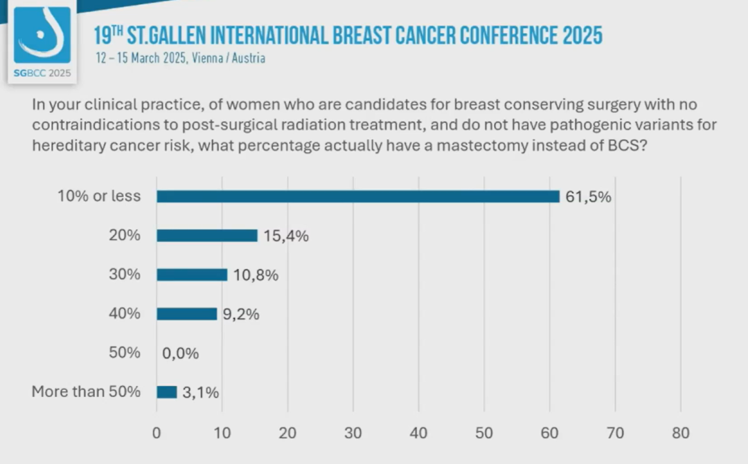 (1)在您的临床实践中,对于那些符合保乳手术条件、没有术后放疗禁忌症、且没有遗传性癌症风险致病性突变的女性,实际有多少人选择了乳房切除术而不是保乳手术?