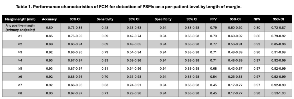 研究结论:荧光共聚焦显微镜无法排除局部/较窄的阳性手术切缘;但是,其检测≥3 mm阳性手术切缘的准确性较高。鉴于<3 mm的切缘临床意义尚不明确,未来应在比较研究中进一步评估荧光共聚焦显微镜对阳性手术切缘≥3 mm的临床实用性。