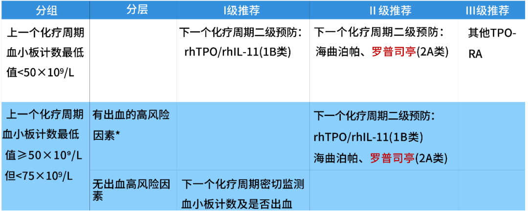 2. 针对上一个化疗周期血小板计数最低值≥50x109/L但<75x109/L,且有出血的高风险因素患者,II级推荐新增罗普司亭(2A类)。