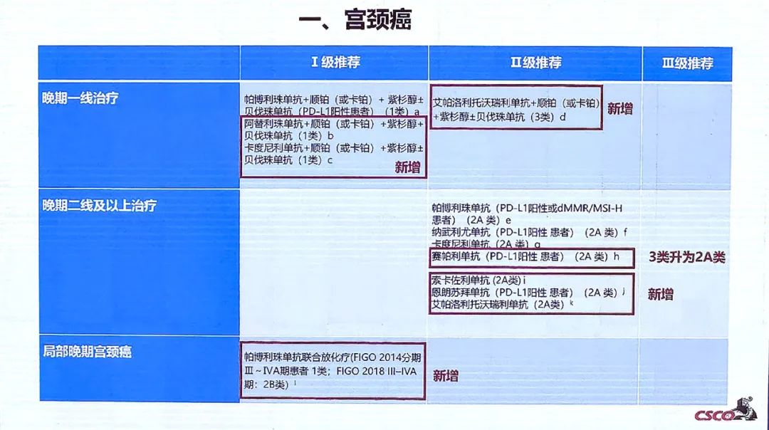 对于宫颈癌晚期二线及以上治疗,新增艾帕洛利托沃瑞利单抗为Ⅱ级推荐,2A类证据。