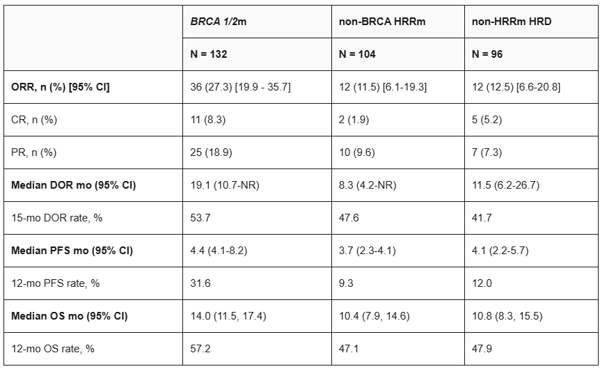 ★中位随访时间为10.8个月,HRR野生型/HRD阳性患者(亚组3;n=96)的ORR为12.5%(95%CI:6.6%-20.8%),5.2%的患者达到CR。DCR为62.5%,中位DOR为11.5个月(95%CI:6.2-26.7个月)。15个月DOR率为41.7%。