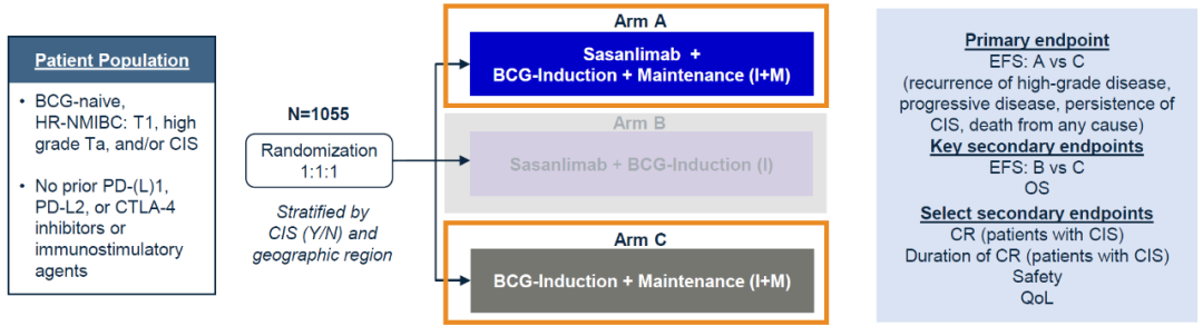 CREST试验是一项III期、国际多中心、随机、开放性、三个平行组研究,旨在评估PD-1单抗Sasanlimab联合卡介苗(BCG)(仅诱导或诱导+维持)治疗,与单独使用BCG(诱导+维持)治疗相比,在既往未接受BCG治疗的高危非肌层浸润性膀胱癌(NMIBC)患者中的疗效。患者被随机分配接受以下3种治疗:Sasanlimab每四周皮下(SC)注射300mg,最多注25个周期,同时联合卡介苗每周一次连续六周(诱导期),之后进行(A组;n=352)或不进行(B组,n=352)BCG维持治疗;或者仅接受(BCG)诱导伴维持治疗直至25个周期(C组,n=351)。主要终点是由研究者评估的A组和C组之间的无事件生存期(EFS),关键次要终点包括由研究者评估的B组和C组之间的无事件生存期(EFS),A/B组与C组之间的OS。在伴有原位癌(CIS)的患者中,完全缓解率(CR)及其持续时间是额外次要终点。