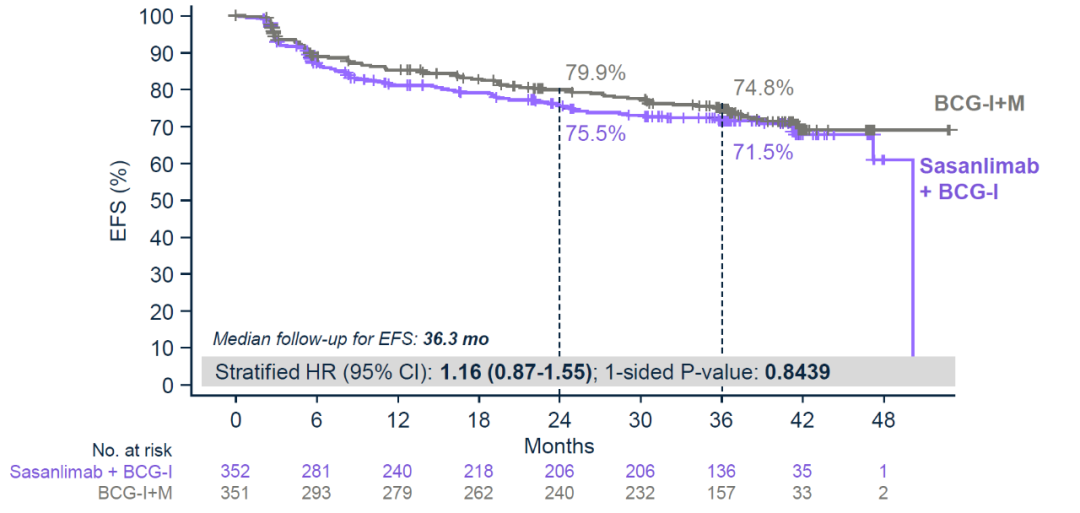 在经过超过3年的随访时间后,研究结果显示,Sasanlimab联合BCG诱导+维持治疗,相较于单纯BCG诱导+维持治疗,可以显著改善高危NMIBC患者的EFS,尽管两组的mEFS均未达到,但联合组可以将患者疾病进展或死亡的风险降低32%,HR=68;在36个月时,Sasanlimab联合BCG诱导+维持组的EFS率达到82.1%,而单纯BCG组仅为74.8%。