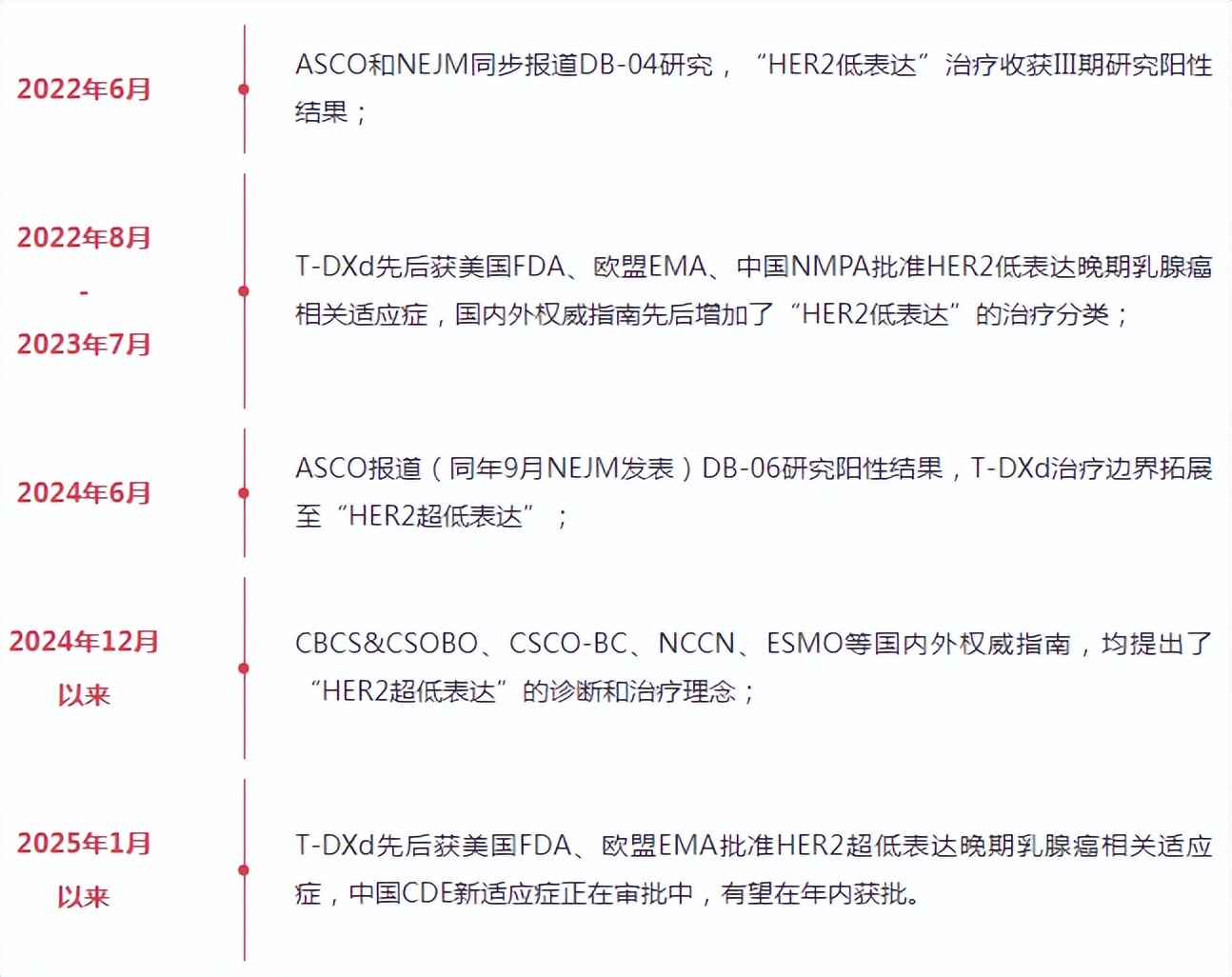 在2025年4月更新的ESMO在线指南中:针对内脏危象的HR+/HER2-晚期乳腺癌患者的T-DXd治疗应用人群,也由既往的HER2低表达扩大至HER2超低表达。