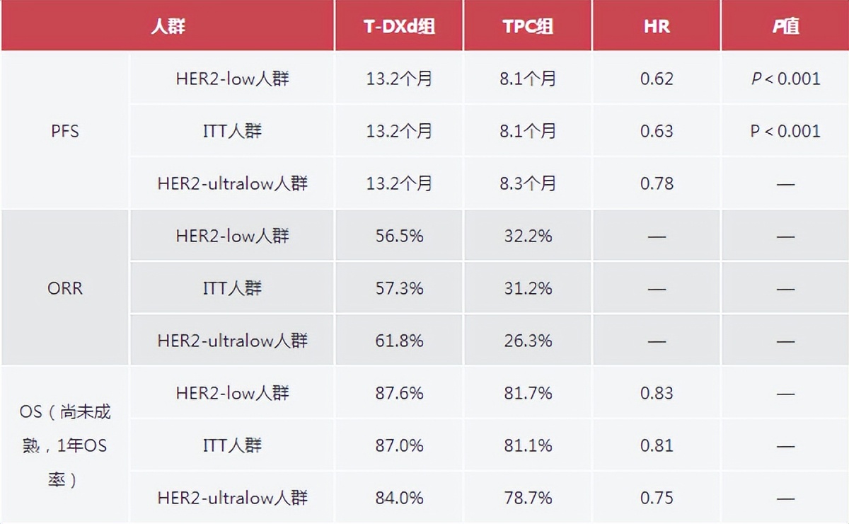 该研究已经证实:无论是意向性治疗人群(ITT)(HR 0.63),还是HER2低表达(HR 0.62)、HER2超低表达(HR 0.78),T-DXd治疗均可相较于化疗降低疾病进展或死亡风险,中位PFS均超过13个月,ORR也有2~3倍的提升;OS尚未成熟,但已显示获益趋势。