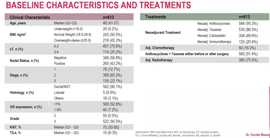 研究方法:这项回顾性研究纳入了2000年至2023年间在12个欧洲中心接受NAT治疗的I-III期TNBC患者(ER<10%,PgR<10%,HER2阴性)共1532例。其中,47.8%的患者达到了pCR。对治疗前活检标本中的TILs进行了评估,共有613例pCR患者的TILs数据可用(占pCR患者的83.6%),并构成了本次分析的研究队列。评估了无远处复发生存(DRFS)和总生存期(OS)。