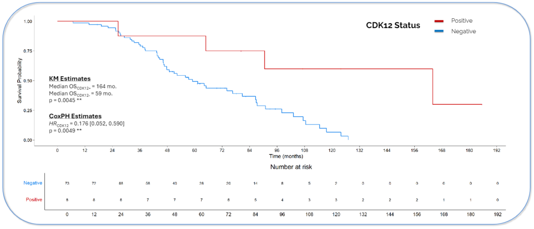在总体人群中,Cox比例风险(CoxPH)模型显示,CDK12突变患者的中位OS相较于无突变患者更长(HR 0.17,95%CI:0.052–0.590,P=0.0049)。在CDK12突变患者中,有3例进展为脑转移,6例接受了T-DXd治疗。调整年龄和脑转移后的CoxPH模型显示,CDK12突变的存在与T-DXd治疗的OS改善显著相关(HR 0.062,95%CI:0.005–0.771,P=0.030)。