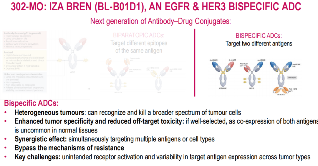 张剑教授:302MO这项研究是由吴炅教授和我共同牵头发起的,由杜益群教授在本届ESMO BC年会上做口头报告,呈现研究相关内容。这项临床研究主要是基于当前非常热门的双抗ADC iza-bren(BL-B01D1)展开的,该药物由EGFR x HER3双特异性抗体通过稳定的四肽可裂解连接子与新型拓扑异构酶I抑制剂有效载荷(Ed-04)偶联而成。既往该药物已经在肺癌患者治疗当中产生了一定的疗效,本研究旨在探索该药物在既往接受过治疗的HER2阴性(HER2-)乳腺癌患者中的安全性和有效性。