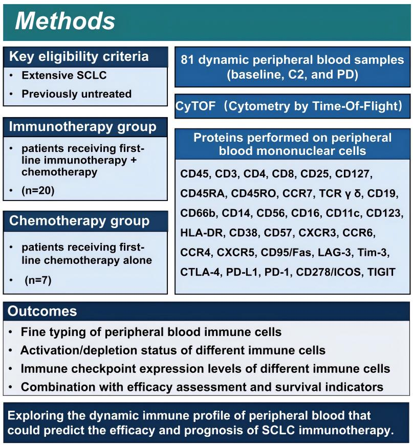 本研究利用ES-SCLC患者动态外周血等临床资源,将单细胞质谱流式技术应用于ES-SCLC患者免疫治疗的动态监测中。通过对以下蛋白进行标记:CD45、CD3、CD4、CD8、CD25、CD127、CD45RA、CD45RO、CCR7、TCRγδ、CD19、CD66b、CD14、CD56、CD16、CD11c、CD123、HLA-DR、CD38、CD57、CXCR3、CCR6、CCR4、CXCR5、CD95/Fas、LAG-3、Tim-3、CTLA-4、PD-L1、PD-1、CD278/ICOS、TIGIT,对ES-SCLC患者的外周血免疫细胞进行高维度精细分型。进一步结合疗效评估及生存指标,探索可以预测SCLC免疫治疗疗效和预后的外周血动态免疫特征。