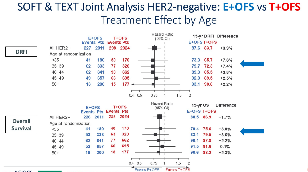 此次报道SOFT/TEXT联合分析的15年数据显示,总体而言,OFS+AI、OFS+TAM联合治疗优于TAM单药治疗。这些结果与临床实践相符。尤其在需要化疗的复发高危患者中,包括年轻(<35岁)、组织学3级等恶性程度往往较高的肿瘤中,OFS+AI显示了持续生存获益。15年的随访结果进一步坚定了我们在临床中使用这种治疗策略的信心。