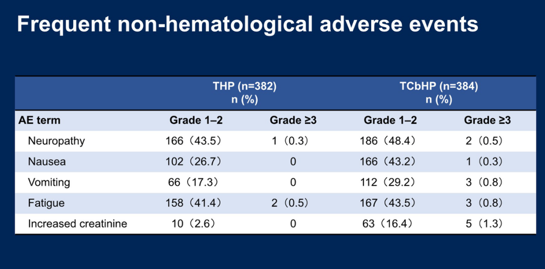 与TCbHP组相比,THP组患者的3-4级不良事件(79/382[20.7%]vs 133/384[34.6%])和严重不良事件(5/382[1.3%]vs 18/384[4.7%])较少。THP组最常见的3-4级不良事件为中性粒细胞减少(26/382[6.8%]vs TCbHP组的63/384[16.4%])、白细胞减少(21[5.5%]vs 57[14.8%])和腹泻(10[2.6%]vs 16[4.2%])。未发生与治疗相关的死亡。