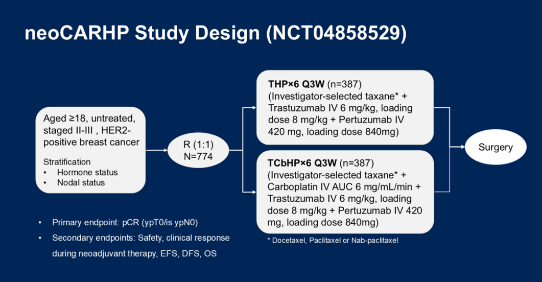 neoCARHP是一项在15家医院进行的多中心、开放标签、随机、非劣效性III期试验。符合条件的患者为年龄≥18岁,未经治疗的II-III期浸润性HER2阳性乳腺癌患者。患者根据淋巴结和激素受体状态进行分层,并随机(1:1)接受六个3周周期的研究者选择的紫杉烷类(多西他赛、紫杉醇或白蛋白结合型紫杉醇)联合曲妥珠单抗(首剂8mg/kg,之后每3周6mg/kg)和帕妥珠单抗(首剂840mg,之后每3周420mg)治疗,同时随机分配接受卡铂(TCbHP组;AUC mg/mL/min)或不接受卡铂(THP组)治疗。主要终点是乳房和腋窝的病理完全缓解率(pCR,ypT0/is ypN0),在改良意向治疗(mITT)人群中进行评估(所有接受至少一剂研究药物的患者)。主要疗效分析采用Cochran-Mantel-Haenszelχ²检验(根据淋巴结和激素受体状态分层),预设非劣效性界值为-10%。假设每组pCR率为62.8%,774名患者将在一侧显著性水平为0.025时提供80%的效力,假设失访率为5%。安全性在所有接受研究药物的患者中进行评估。
