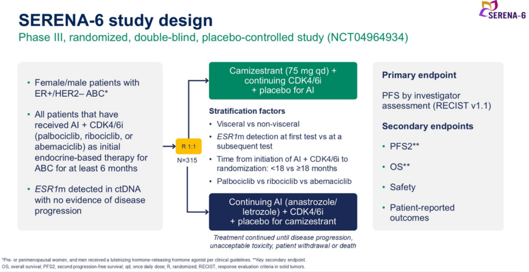 本届ASCO大会上公布的SERENA-6研究进一步验证了这一新模式。该研究入组了接受AI+CDK4/6i(阿贝西利/哌柏西利/瑞波西利)一线治疗≥6个月的HR+/HER2-晚期乳腺癌患者,每2-3个月用ctDNA检测ESR1突变,并同步进行常规影像检查。检测到ESR1突变但无疾病进展的患者按1:1比例随机分为两组,一组患者接受Camizestrant+CDK4/6抑制剂(类型和剂量保持不变)+安慰剂治疗,另外一组患者继续使用AI+CDK4/6抑制剂+安慰剂治疗。