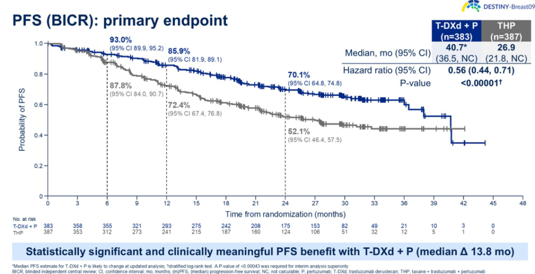 本次会议主要报道了T-DXd+P组与THP组的数据。研究结果显示,相较于THP治疗组,T-DXd+P治疗组无论是盲态独立评审委员会(BICR)评估的PFS,还是研究者评估的PFS,均取得了显著的治疗获益。BICR评估的结果显示,T-DXd+P组和THP组的中位PFS分别为40.7个月和26.9个月,风险比(HR)为0.56(95%CI:0.44-0.71),P<0.00001。对于晚期乳腺癌患者的一线治疗,T-DXd+P方案给出了令人满意的答案,降低了患者44%的死亡风险。