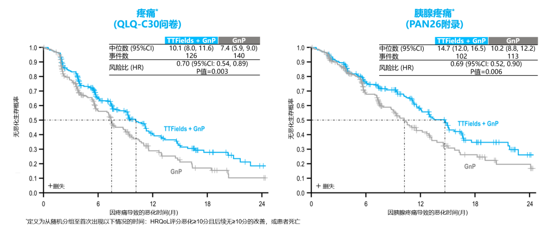 在生活质量(QoL)方面,TTFields联合化疗可缓解疼痛症状,显著改善患者生活质量。TTFields联合化疗将无疼痛生存期延长了6.1个月(中位无疼痛生存期:15.2个月vs 9.1个月,HR=0.74,P=0.027),总体健康状态无恶化时间更长(7.1个月vs 5.7个月,HR 0.77,P=0.023)(图3)。TTFields安全性较好,联合治疗不会加重化疗全身毒性。TTFields的主要不良事件为轻中度的皮肤AE,包括皮炎(27.7%)、皮疹(17.5%)和瘙痒(15.0%)等。