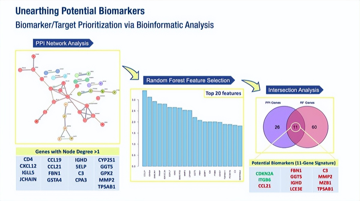 基于数据库中12名对放化疗有反应的宫颈癌患者和9名无反应者的转录组学数据,研究人员进行了主成分分析(PCA),并鉴定出143个差异表达基因。通过蛋白质-蛋白质相互作用(PPI)网络分析和随机森林模型,研究人员发现了重叠基因,从而揭示了一个由11个基因组成的生物标志物特征,可用于区分治疗有反应者和无反应者。