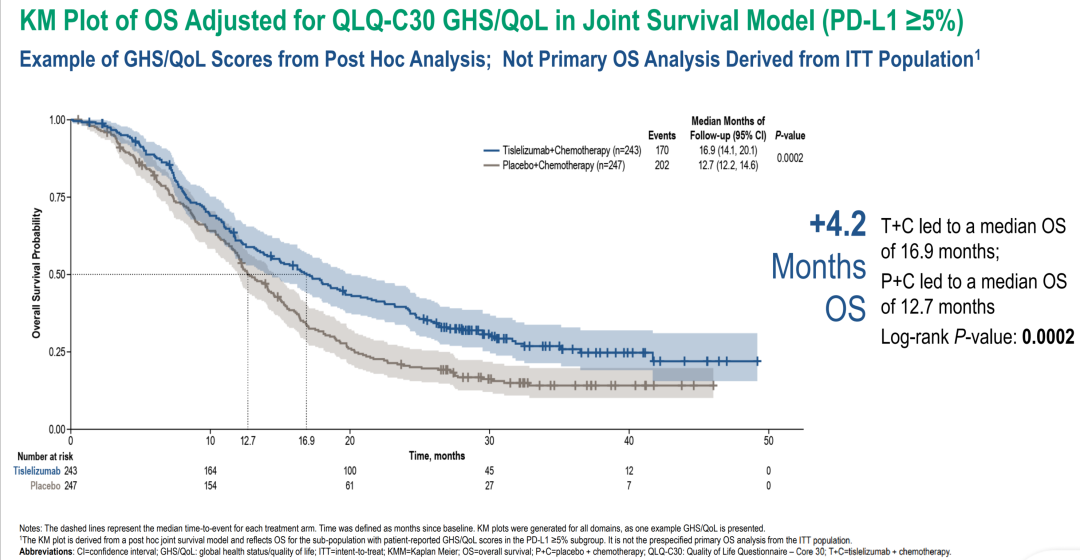 基于联合生存模型,PD-L1≥5%患者人群中报告GHS/QOL评分患者的OS结果显示,T+C组实现16.9个月的mOS,较P+C组的12.7个月延长4.2个月(log-rank P=0.0002),具有显著的临床实践意义。