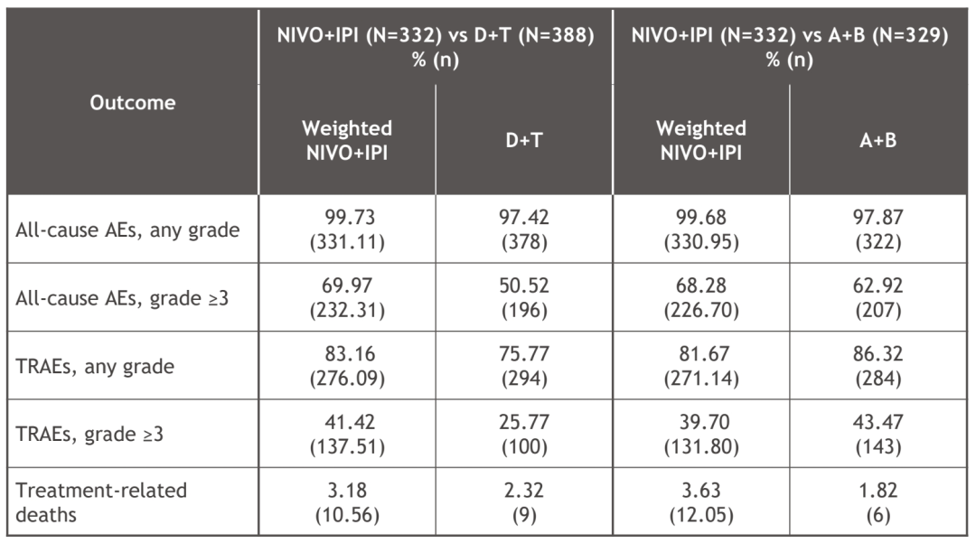 安全性方面(表3),N+I加权后的≥3级治疗相关不良事件(TRAEs)发生高于D+T(25.8%),但低于A+B(43.5%),治疗相关死亡率与两者相当。