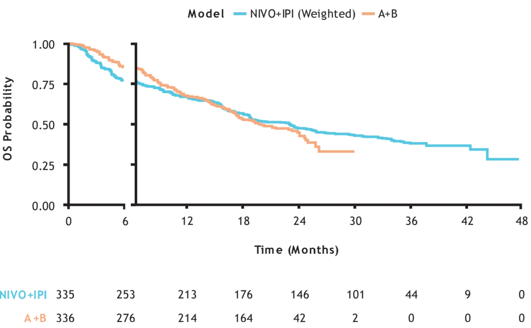 工藤正俊教授:此项研究将N+I方案、D+T方案以及A+B方案进行匹配调整间接比较(MAIC)。MAIC是一种在缺乏头对头研究情况下受到广泛认可的、用于比较不同临床研究结果的统计方法。该研究使用已发表的N+I数据与D+T、A+B数据进行匹配比较。结果显示:N+I相较于其他免疫治疗在无进展生存期(PFS)、总生存期(OS)和客观缓解率(ORR)方面均显示出更优的结果。与D+T相比,在前6个月内,N+I的PFS显著更优(HR 0.57),而在6个月后,其PFS(HR 0.71)和OS(HR 0.74)均显著更优。与A+B方案相比,在前6个月内,N+I的PFS(HR 1.05)和OS(HR 1.67)表现较差;而在6个月后,其PFS(HR 0.52)和OS(HR 0.67)则显著优于A+B。此外,N+I组ORR较两者也呈现优势趋势。以上便是本次MAIC分析的主要结果。