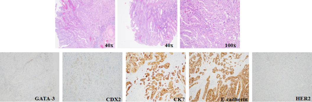 腺癌,考虑胃原发可能性大。IHC:CK7(+)、Villin(+)、CDX2部分(+)、CK20(-)、GATA-3(-)、ER(-)、HP(-)、P53强弱不等(+)、Ki67约80%(+)。