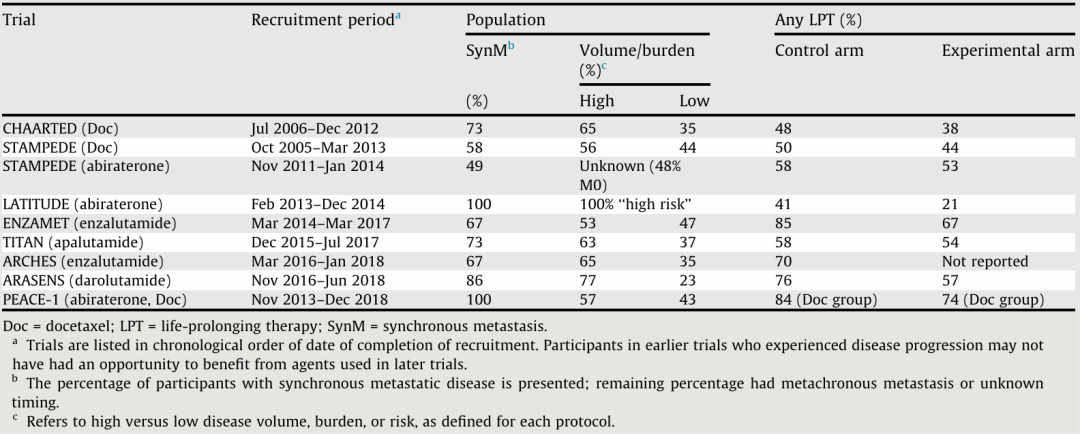 对于这些药物在mHSPC中比在mCRPC中具有明显更好获益的一个简单解释是,假设对照组的参与者无法获得后续延长生命的治疗。但事实并非如此:下表显示,各试验中的对照组患者获得后续有效治疗(在大多数情况下包括实验组使用的药物)的比例实际上更高。这些药物在mHSPC和mCRPC中的使用存在根本区别。