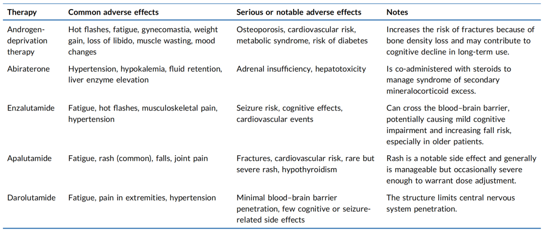 除传统ADT、化疗等以外,雄激素受体通路抑制剂(ARPI)已成为mHSPC的重要治疗药物。第一代药物包括氟他胺、比卡鲁胺和尼鲁米特,第二代药物包括阿帕他胺、恩扎卢胺和达罗他胺等。第二代药物被认为效力更强。达罗他胺是唯一不透过血脑屏障的ARPI,有助于减少神经系统副作用。阿比特龙是一种强效CYP17A1抑制剂,可阻断肾上腺、睾丸和肿瘤本身的雄激素生物合成。主要不良反应见下表。