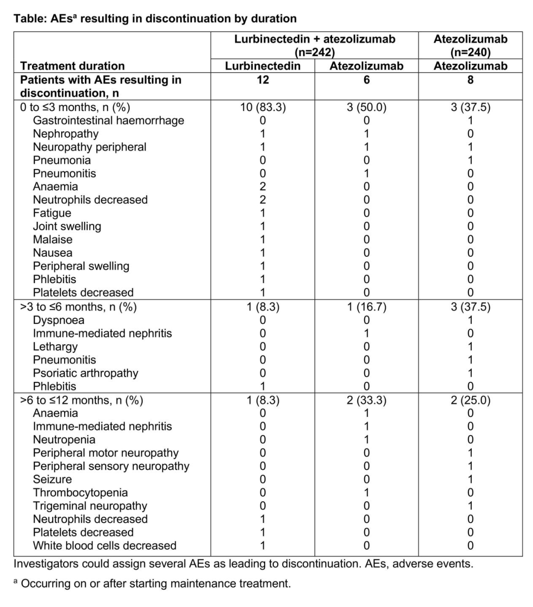 芦比替定+阿替利珠单抗组和阿替利珠单抗单药组的3/4级中性粒细胞减少发生率分别为4.5%和0.4%;中性粒细胞减少性发热发生率分别为1.7%(含1例致命事件)和0。芦比替定+阿替利珠单抗组中有12例(5.0%)患者发生致命性AE,阿替利珠单抗单药组中有6例(2.5%)。