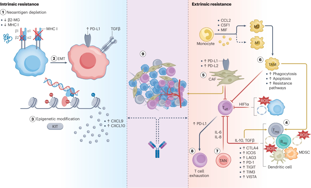 ICIs耐药是一个错综复杂、多重因素交织的过程,其核心在于肿瘤内在特征、外在影响以及TME内适应性变化三者之间的协同作用,它们可以序贯发生,也可以同时发生,并且常常形成互惠式的相互作用。构成这一复杂相互作用的关键因素,包括癌细胞本身(如表型和基因组特征)及其与周围TME的动态相互作用,还可能存在微生物组和器官特异性条件等因素的参与,它们各自的重要性尚无定论,因此暂将各种内外因素在耐药中的作用等同看待。