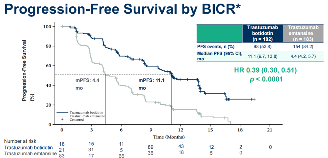 研究数据显示,博度曲妥珠单抗组使既往经治HER2阳性不可切除或转移性乳腺癌患者,较T-DM1组治疗的疾病进展或死亡风险显著下降61%(HR=0.39,95%CI 0.30-0.51,P<0.0001),中位PFS(mPFS)达11.1个月(vs.T-DM1组4.4个月),在所有亚组中均观察到一致的获益趋势,ORR高达76.9%(vs 53.0%);安全性方面,博度曲妥珠单抗组最常见的≥3级不良事件(TEAEs)为眼部相关不良反应,主要表现为角膜疾病、干眼症和视物模糊等,在血液学毒性(如血小板减少)、肝毒性(转氨酶升高)以及间质性肺病/肺炎(ILD/p)的发生率上更低,且胃肠道耐受性良好。而T-DM1组最常见的≥3级TEAEs包括血小板计数降低和中性粒细胞降低等。