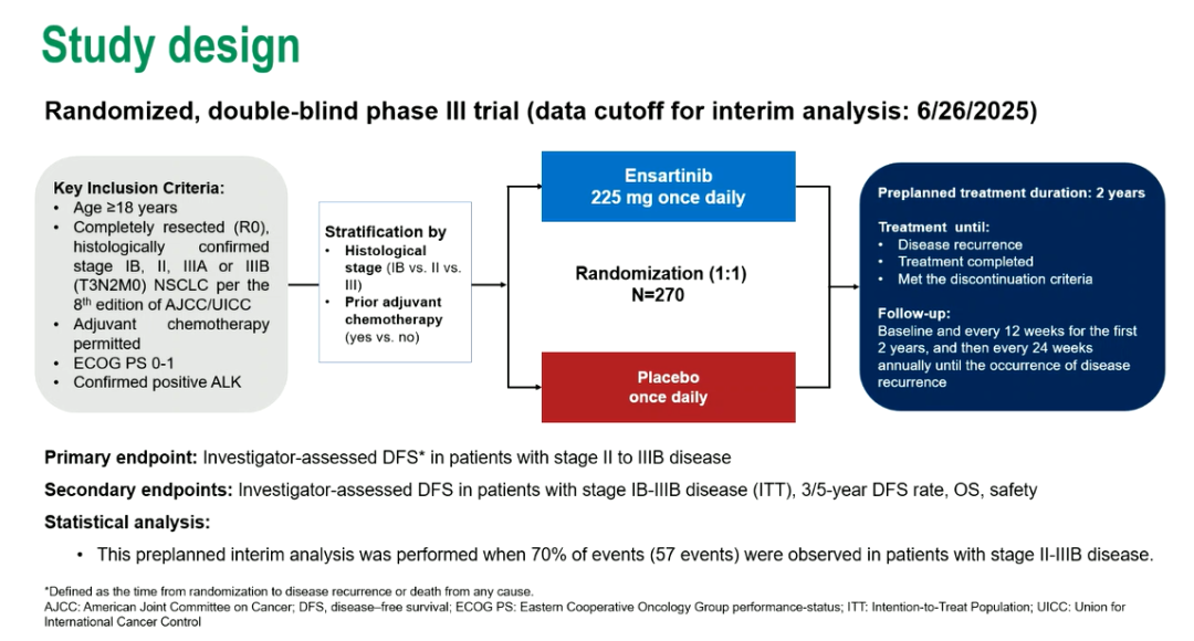 受试者按1:1随机接受恩沙替尼(225 mg QD)或安慰剂治疗2年或2年内疾病复发或达到其他终止治疗的标准,随机分组根据术后肿瘤分期(IB期vs II期vs III期)和是否接受辅助化疗(是vs否)为分层因素。