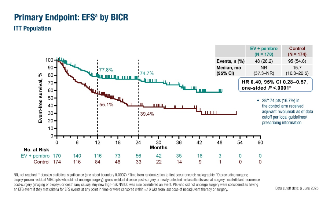 近年来,肌层浸润性膀胱癌(MIBC)的治疗策略取得了重要进展,尤其是免疫检查点抑制剂、靶向治疗、抗体偶联药物等新型疗法拓展了应用范围,有望进一步满足这类患者的保膀胱需求。在近期举行的欧洲肿瘤内科学会年会(ESMO 2025)上,KEYNOTE-905/EV-303研究分析了抗体偶联药物与免疫疗法联合应用的疗效:结果显示,维恩妥尤单抗联合帕博利珠单抗的围术期治疗,在无事件生存期(EFS)和总生存期(OS)方面均表现出统计学显著且具有临床意义的改善。