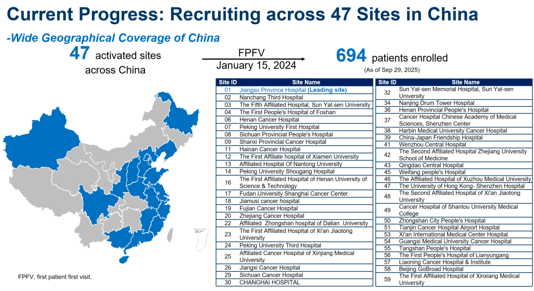 最后值得强调的是,这是一项大规模的全国多中心前瞻性真实世界研究,本研究的牵头中心为江苏省人民医院,目前已经在覆盖全国各地的47家中心中启动,截至2025年9月29日已经纳入了694例患者。感谢江泽飞教授作为全国协调研究者的帮助和指导,以及全国47家中心的患者、研究者和所有工作人员的辛勤付出,使得该研究正在稳步有序地开展中,有望在不久的将来在国内外学术会议和期刊上逐步报道,不仅为T-DXd的临床决策优化提供高质量的真实世界证据,也将为国内乳腺癌学术界开展大规模的前瞻性真实世界研究提供范本和经验。