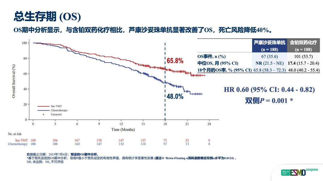 OptiTROP-Lung04研究同时实现了两大突破:首先,芦康沙妥珠单抗单药治疗,就可以使EGFR-TKI耐药患者达到PFS和OS双重获益,芦康沙妥珠单抗治疗组的中位PFS达8.3个月(由BICR评估),而含铂双药化疗对照组仅为4.3个月,即芦康沙妥珠单抗治疗使中位PFS接近翻倍,疾病进展或死亡风险下降了51%(HR 0.49,95%CI,0.39-0.62);其次,芦康沙妥珠单抗组的中位OS尚未达到,但相较于对照组(中位OS为17.4个月),也使死亡风险显著下降40%(HR 0.60,95%CI,0.44-0.82),彻底打破了既往此类患者OS难获益的困局。