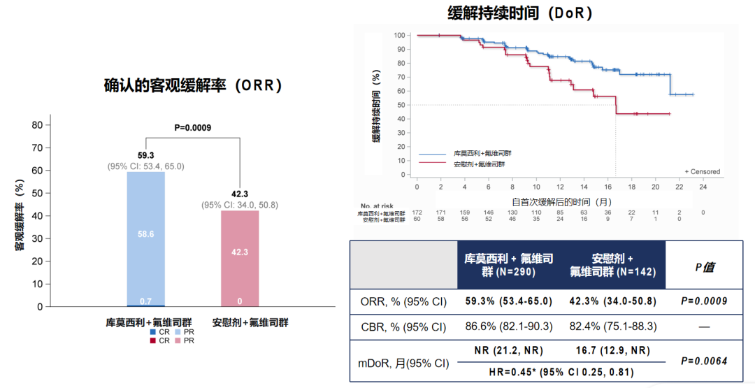 此外,库莫西利治疗组与对照组相比,显著提高经确认的客观缓解率(ORR,59.3%vs.42.3%,P=0.0009),同时中位缓解持续时间(DoR)也显著提高(NR vs.16.7个月,HR=0.45,P=0.0064)。