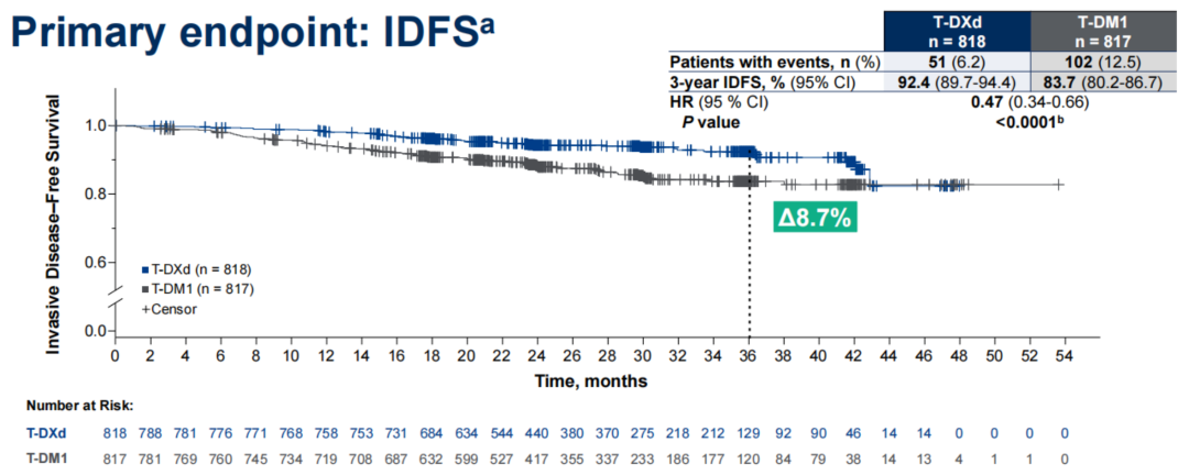 在刚刚结束的2025年ESMO大会上报道的DESTINY-Breast05(DB-05)研究,针对这些新辅助治疗未达到pCR的患者,采用T-DXd强化辅助治疗的3年无浸润疾病生存(IDFS率)高达92.4%,相较于传统的标准强化辅助治疗T-DM1显著提升8.7%(92.4%vs.83.7%,HR 0.47,95%CI:0.34-0.66,P<0.0001)。此外,3年DFS(92.3%vs.83.5%,HR 0.47,P<0.0001)、3年DRFI(93.9%vs 86.1%,HR 0.49)、3年BMFI(7.6%vs 95.8%,HR 0.64)、3年OS(97.4%vs 93.5%,HR 0.61)也显示了T-DXd组的一致获益。这些结果表明,T-DXd能够为non-pCR的HER2阳性乳腺癌患者带来更多治愈希望。