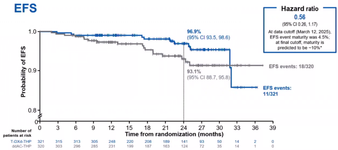 在近期举行的2025年ESMO大会上报道的DESTINY-Breast11(DB-11)研究,探讨了T-DXd序贯THP对比ddAC序贯THP新辅助治疗HER2阳性乳腺的疗效和安全性。结果显示,相较于传统ddAC-THP,T-DXd-THP的pCR得到显著提升(67.3%vs 56.3%,绝对差异11.2%,95%CI:4.0–18.3;P=0.003)。其中HER2阳性患者接受T-DXd-THP新辅助治疗的pCR率高达83.1%,而HR+/HER2+此类既往新辅助治疗效果不佳的患者,T-DXd-THP新辅助治疗的pCR率也高达61.4%。该研究中,T-DXd-THP组已经显示了积极的EFS获益趋势(HR 0.56),治疗安全性和耐受性也表现出色。